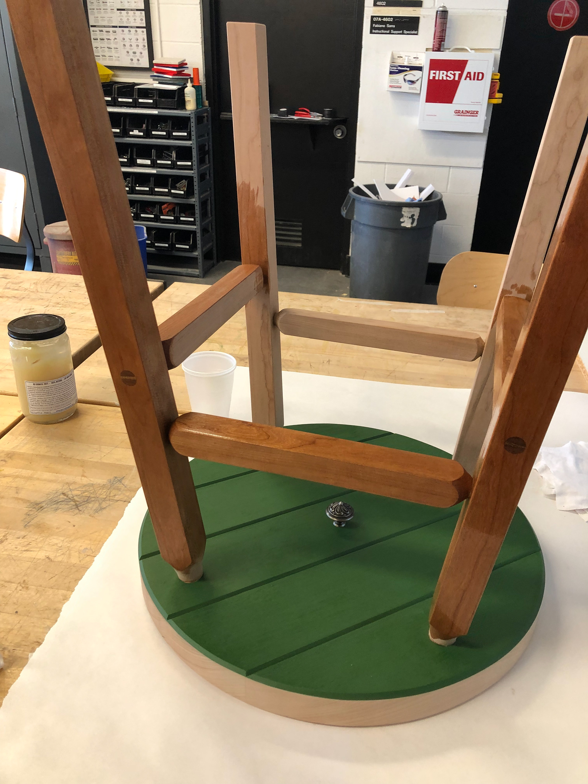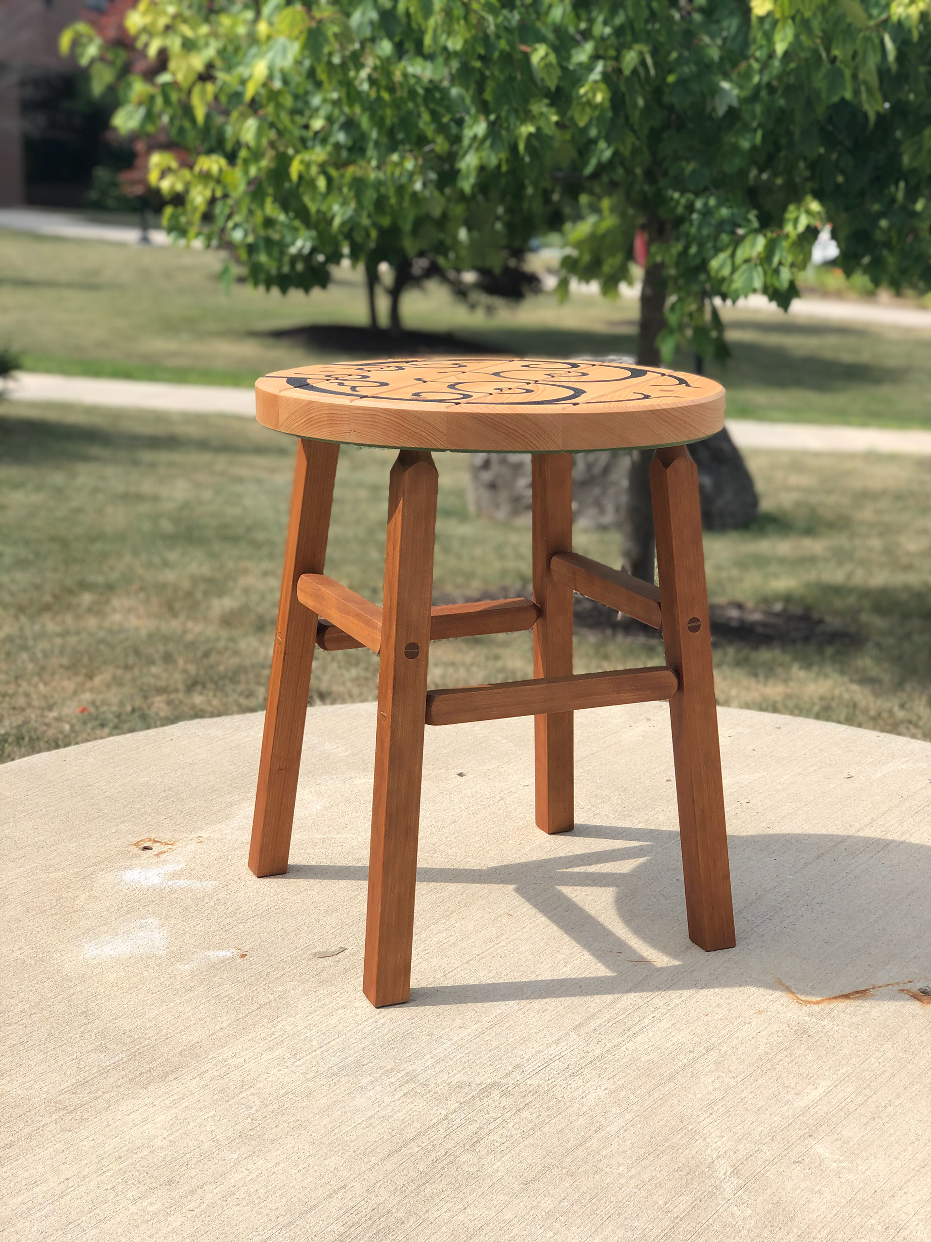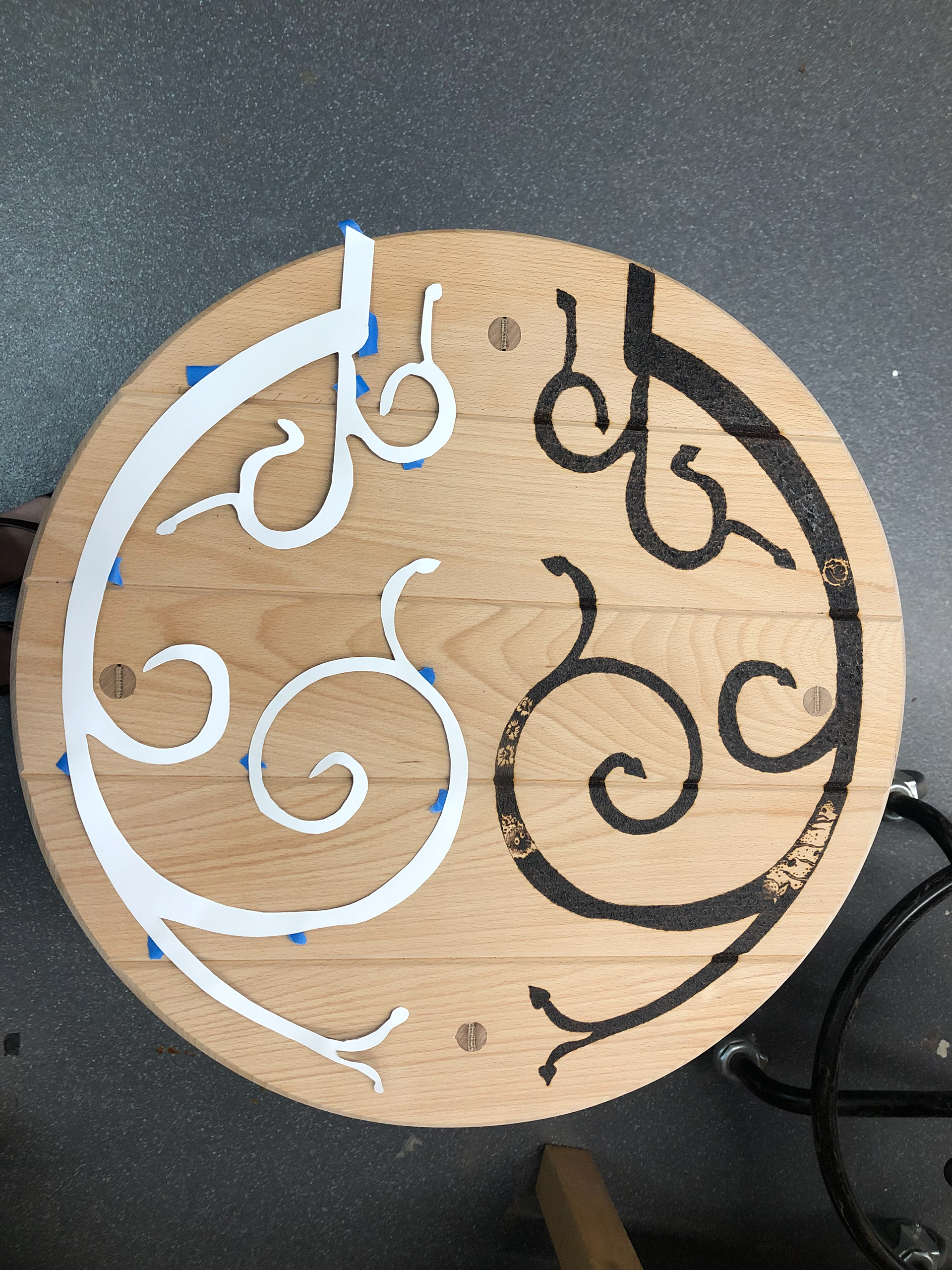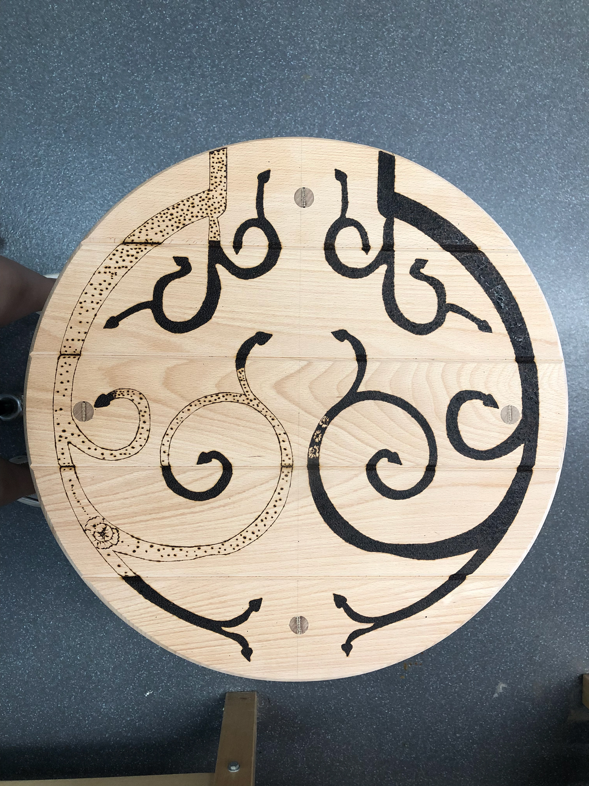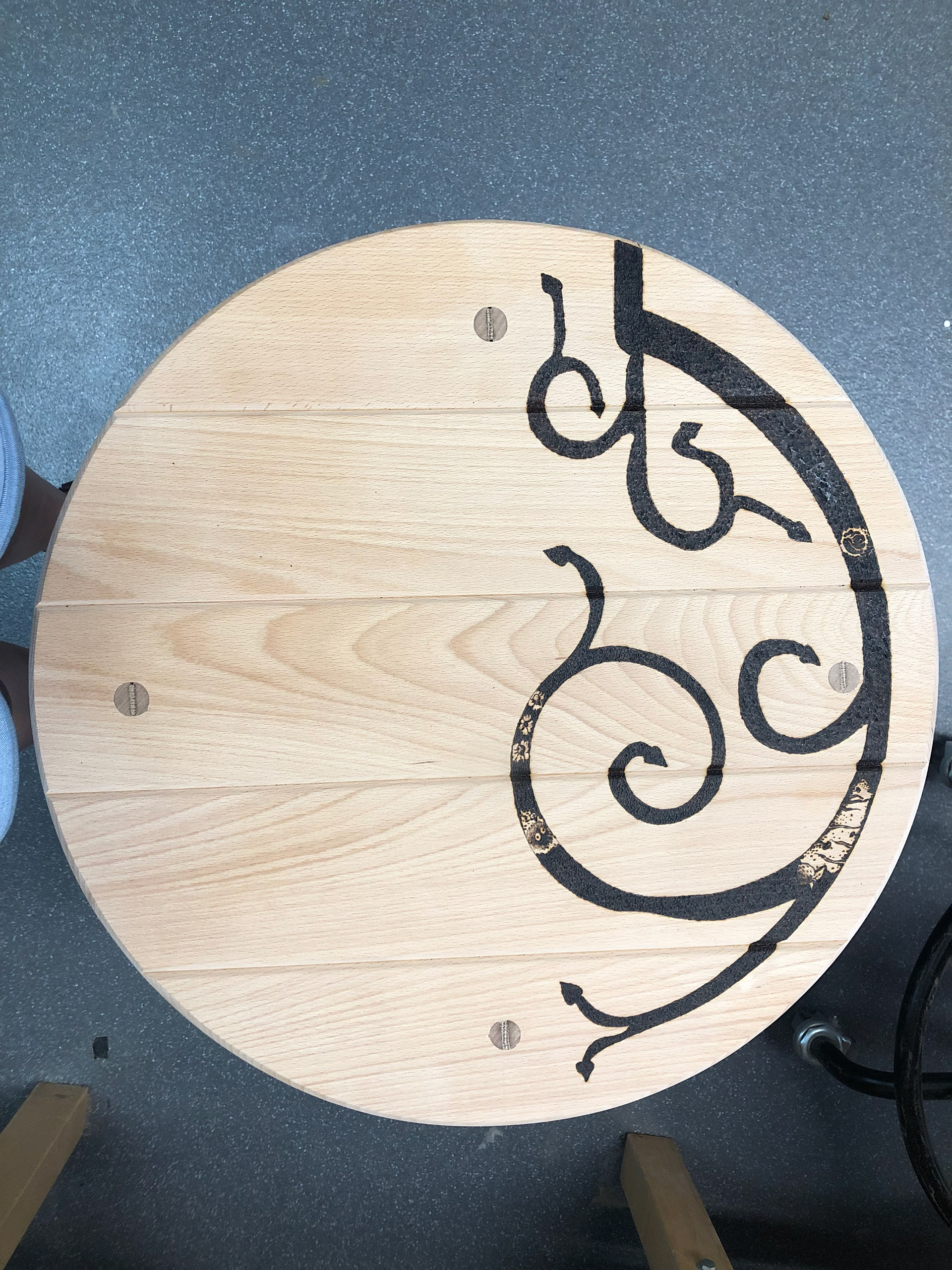 A Table inspired by the door and furniture of Bilbo Baggins from The Lord of the Rings. Tabletop made of beech wood, legs made of cherry. Wood burned design on top. Linseed oil painted underside with antique doorknob. Linseed oil and wax finish.
