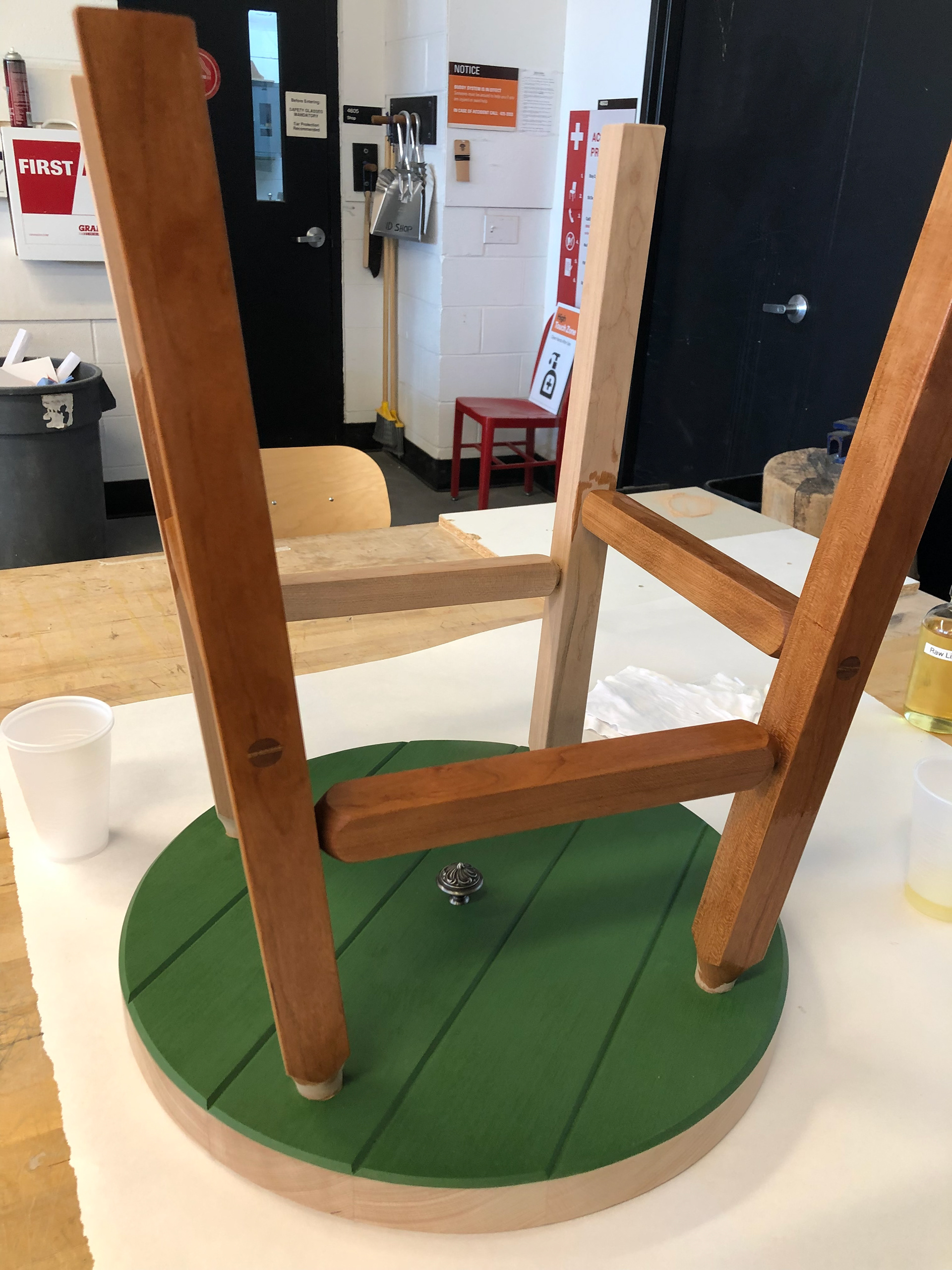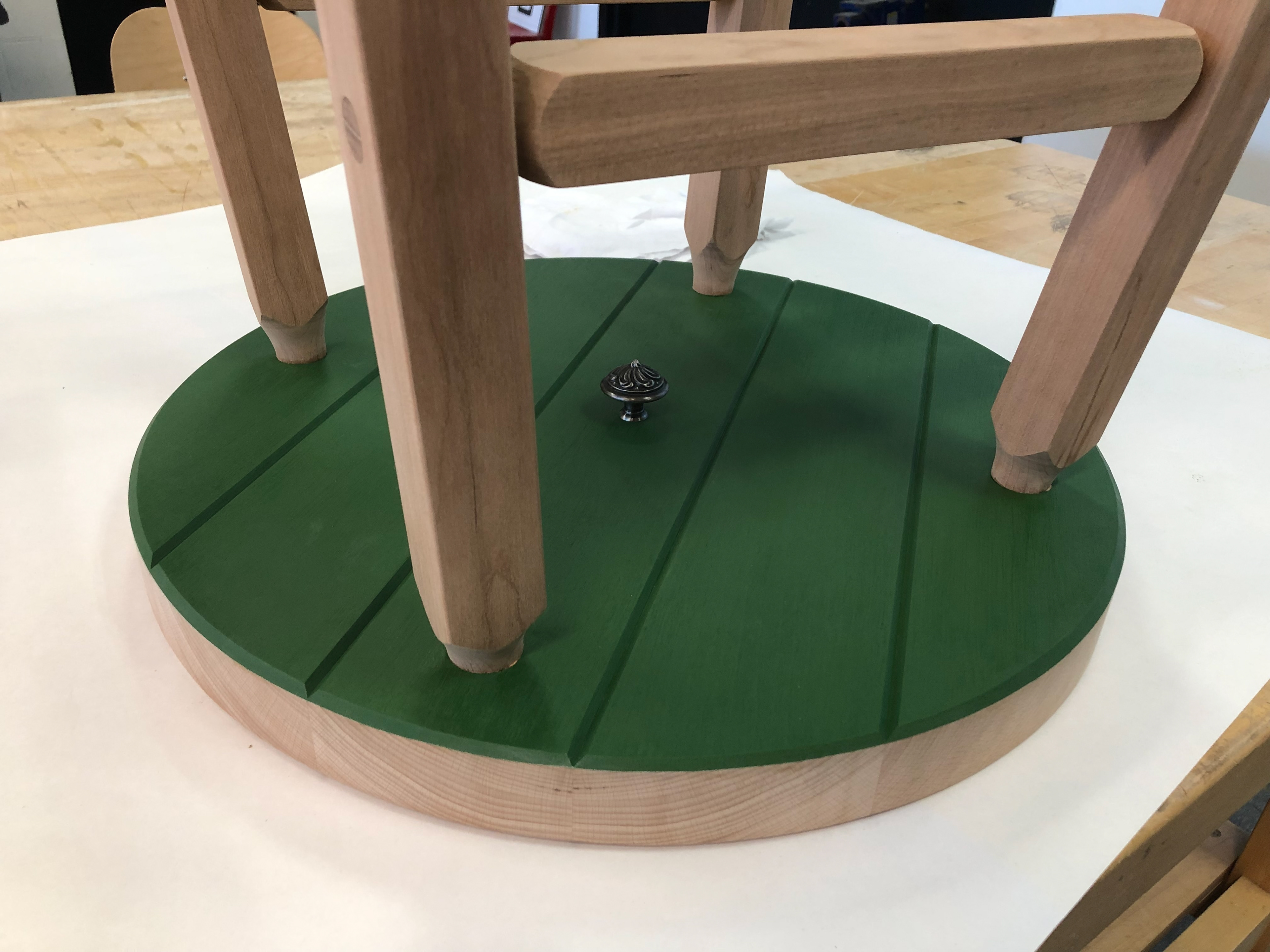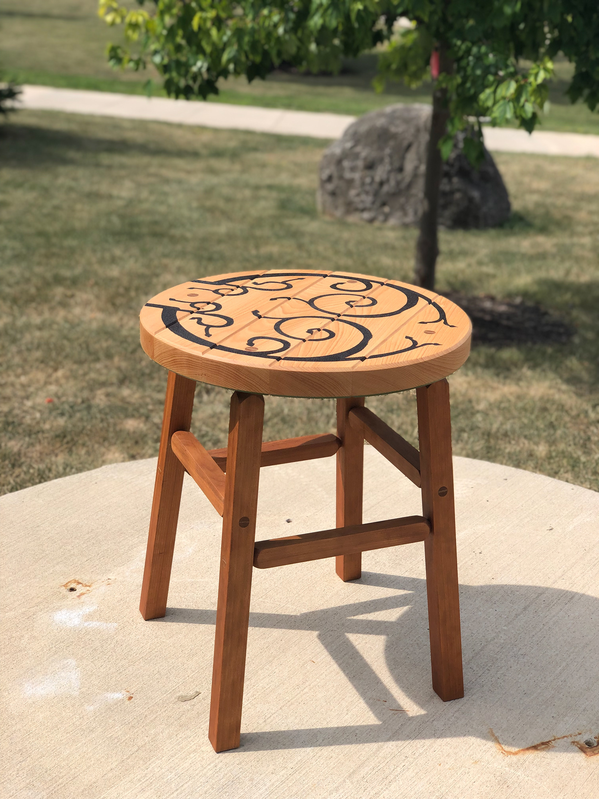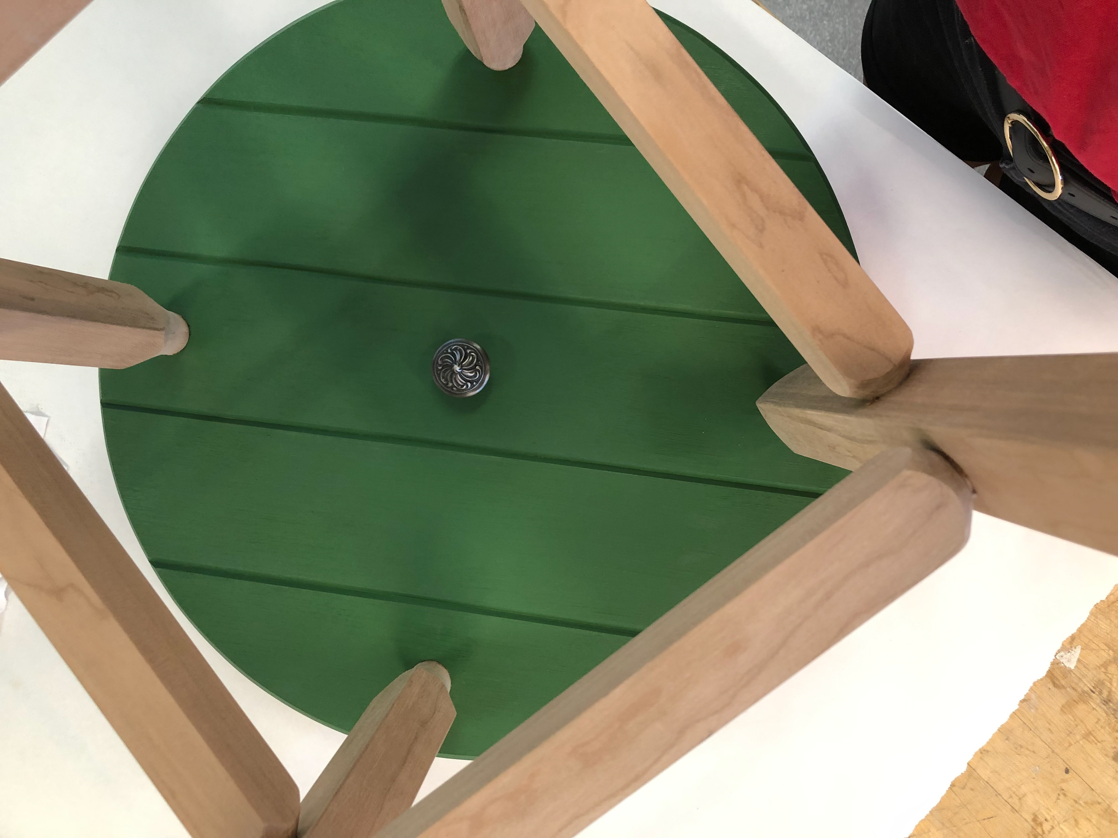 A Table inspired by the door and furniture of Bilbo Baggins from The Lord of the Rings. Tabletop made of beech wood, legs made of cherry. Wood burned design on top. Linseed oil painted underside with antique doorknob. Linseed oil and wax finish.