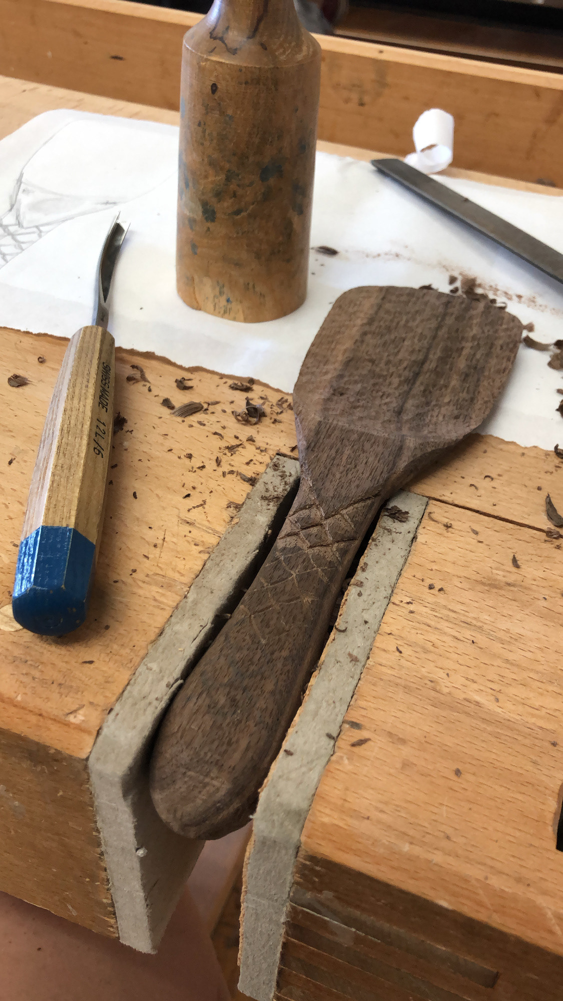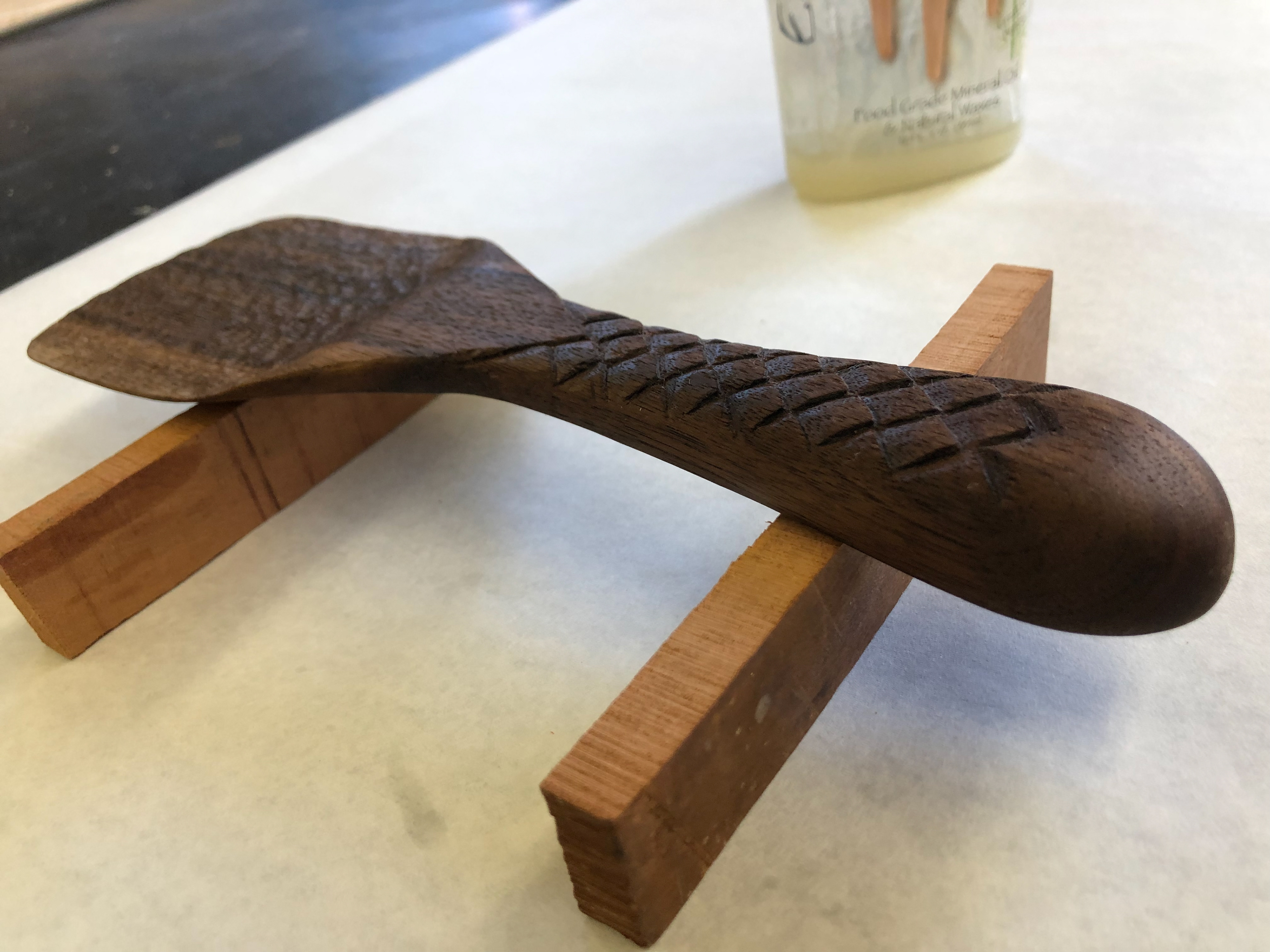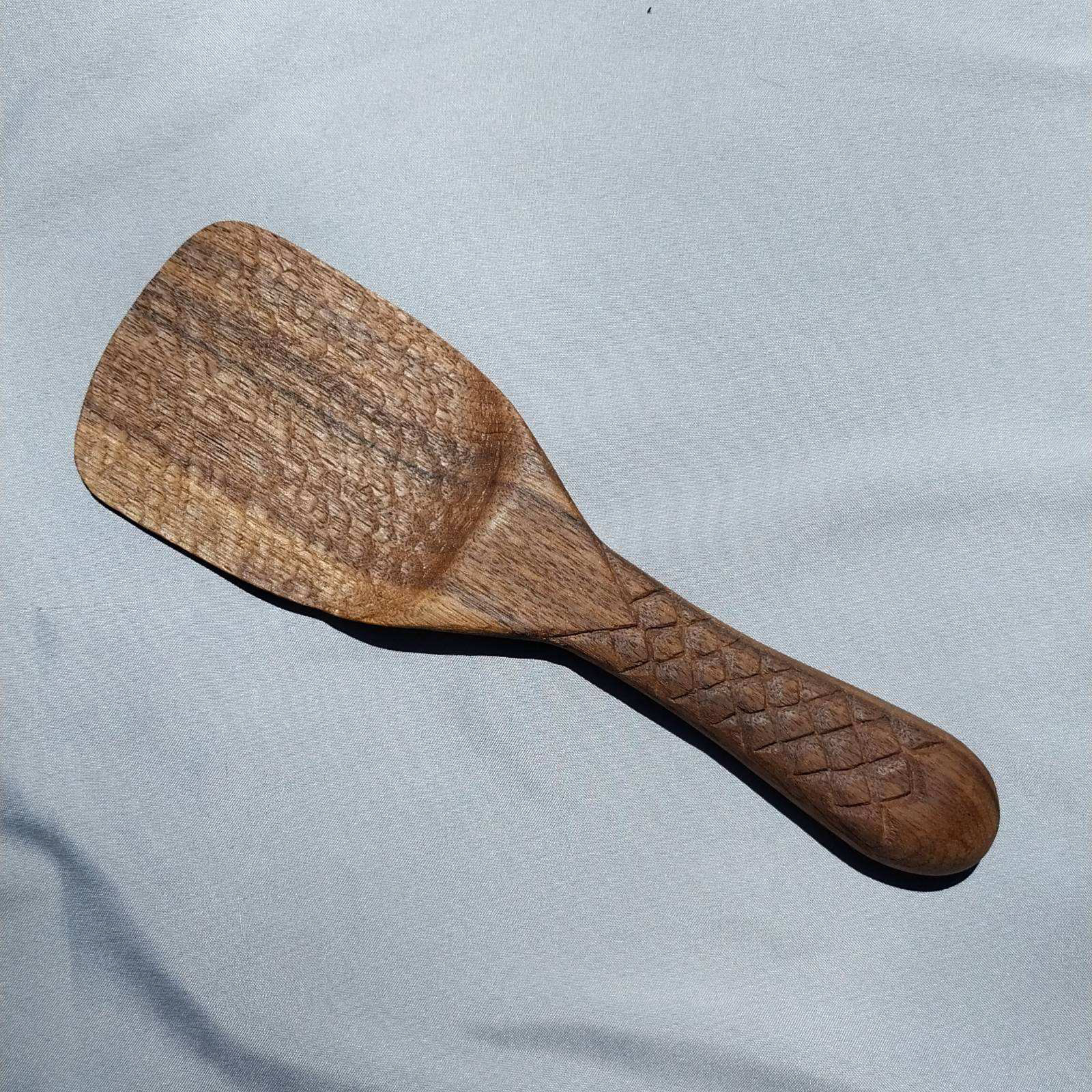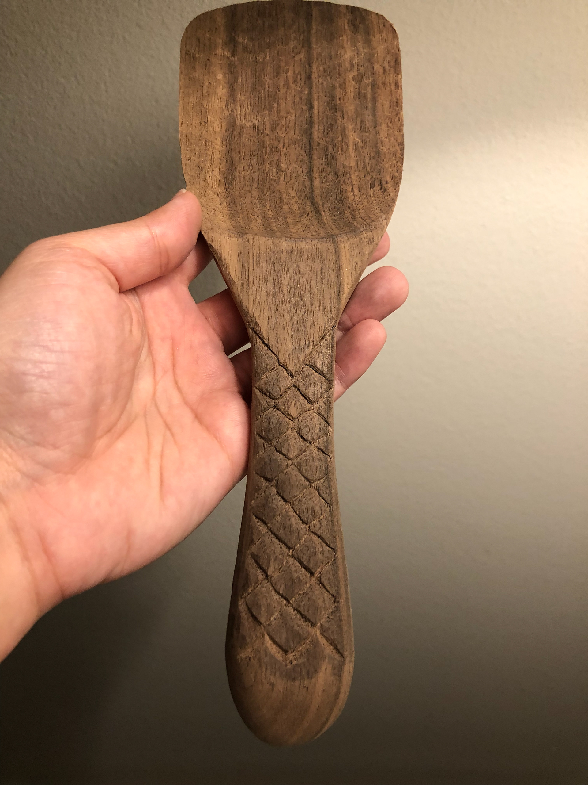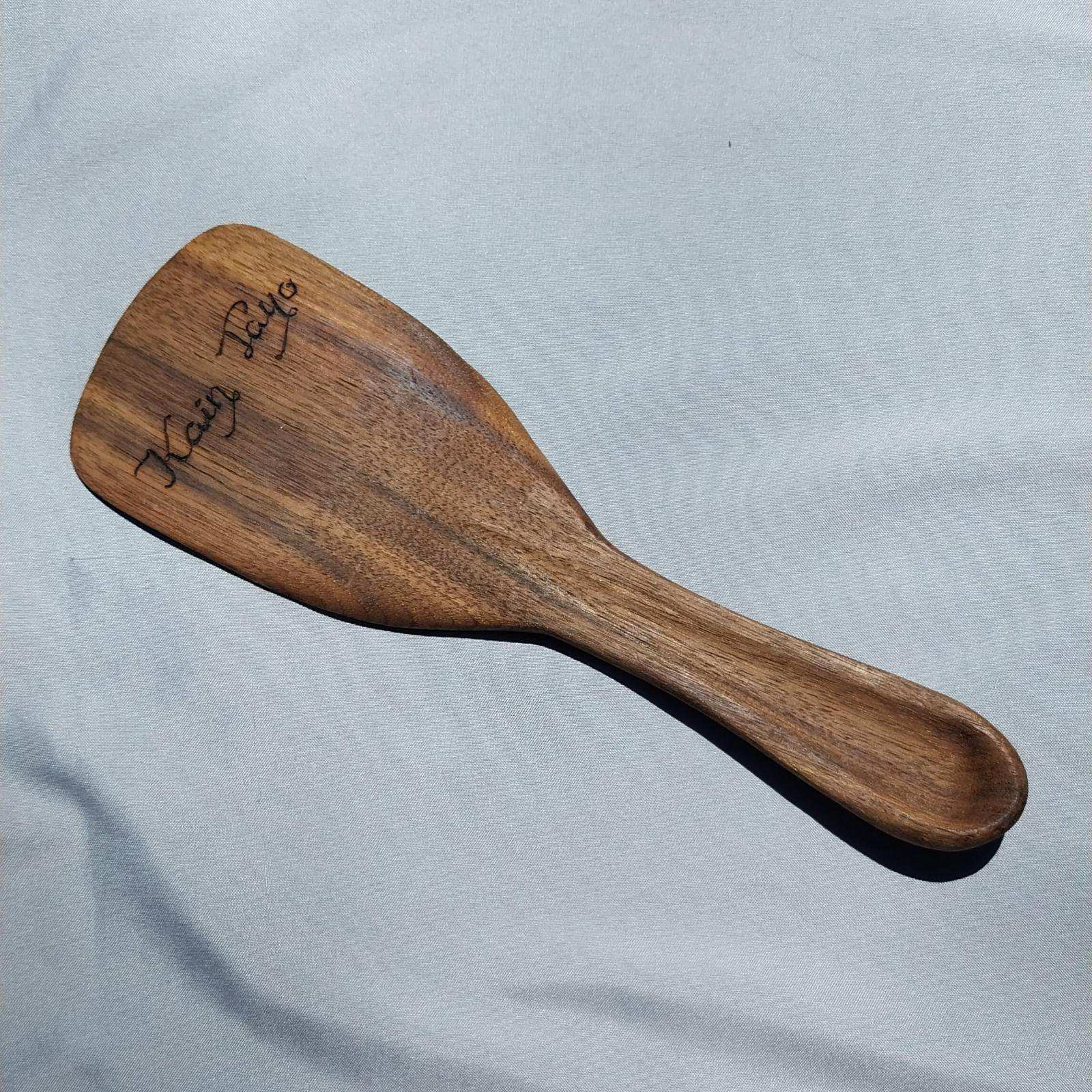 Hand carved walnut. Fish scale inspired handle leading into a triangle that represents the triangle segment of the filipino flag. Wood burned lettering stating "Kain Tayo," meaning "Let's eat," in english.
